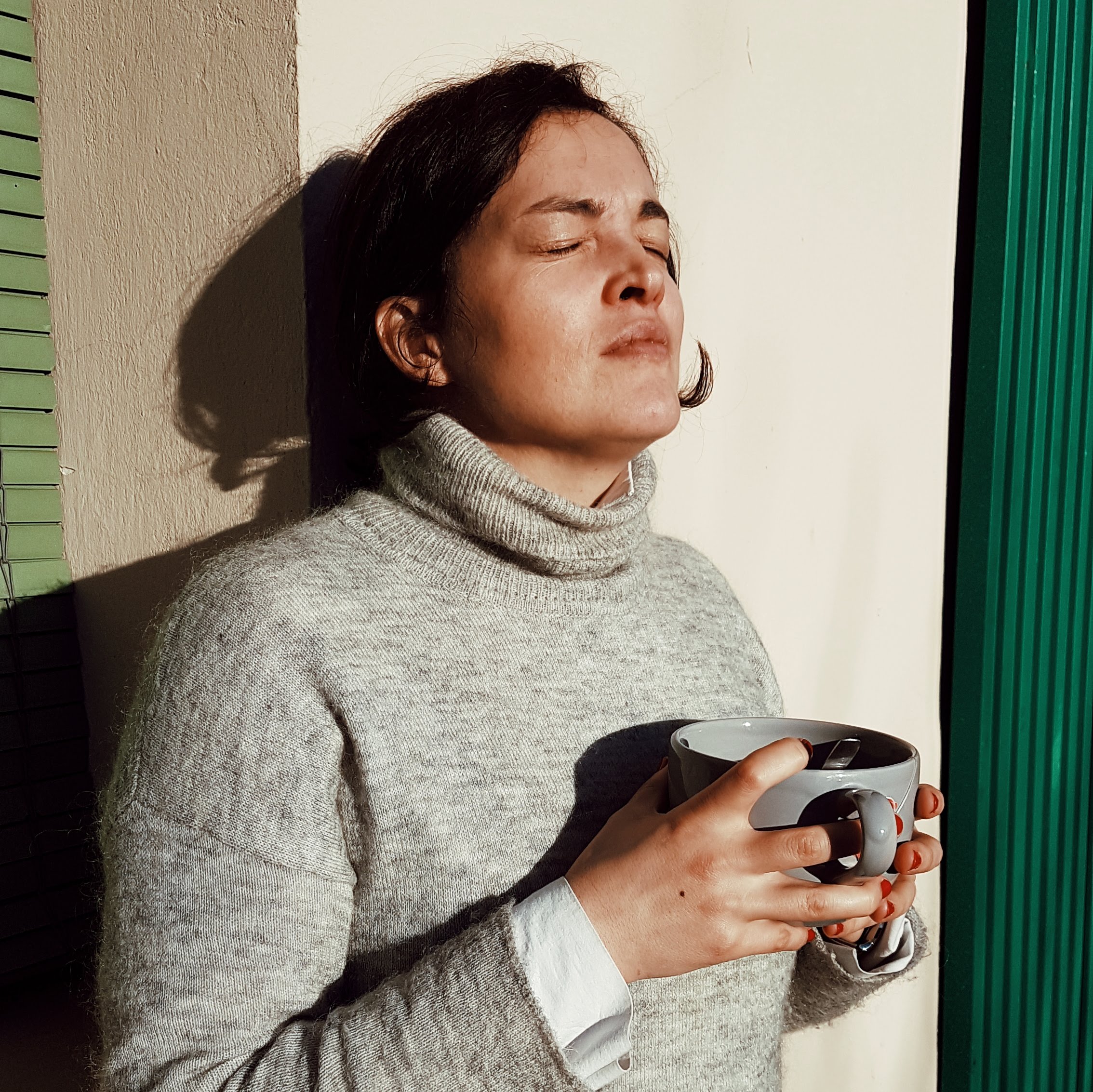 Noemí enjoying a quiet moment in the sun with a warm cup